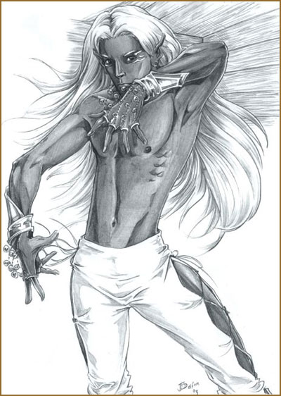 ![]() ![]() ![]() Rowan is the character of my very special friend Suzene, for whom I've done several pics already. Rowan was also the very first commissioned picture I ever did (not this one, but an earlier one). He's a half-drow raised by a bard on the surface. Suzene's got a whole bunch of very cool characters, most of which wear very artist-challenging clothing. XD July 2003 Pencil ![]() ![]()