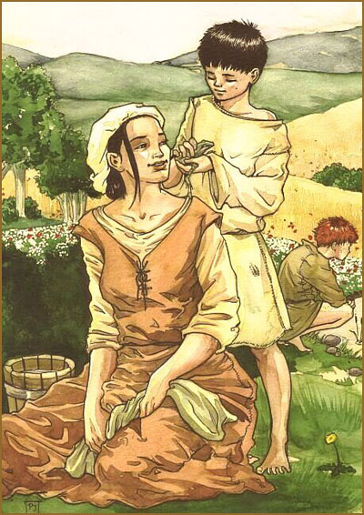 Aidan Cameron (the dark-haired boy) is a character from a novel-in-progress I've been working on for years now. (I sincerely don't know why nearly all the pics I have of him - in here, at least- are of him as a child...) Here he's showing his mother, Moira, a frog he's caught with his friend, Rhys. The first pic of mine to feature golden fields and poppy. The fields beyond our house are full of them, I could walk through them all summer...