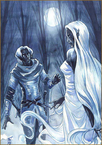Jhael, in search of spiritual guidance, meets a mysterious stranger in the forest... who turns out to be the goddess Eilistraee.