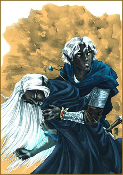 Jhael and his new companion, my husband's character Aseir. This was from an adventure based on "Curse of the Azure Bonds", a computer game/book from the eighties. No, Aseir does not wear metal bikinis. XD
