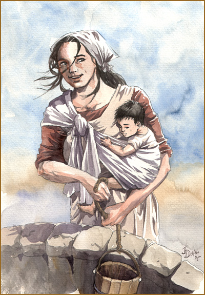 ![]() ![]() ![]() ...mother's day again, and you might remember that last year, I did this pic for my mum. Well, this year, obviously, Moira's son Aidan is six months old (like mine), is only happy when he's near his mum (like mine), and thus, she needs to carry him in the baby cloth all day (like I, mine.) Unlike mine, however, Aidan has hair. XD This pic is a good example of a pic with a great idea behind it and a very personal motivation to be drawn... and too little time to execute properly. That, too, is something any mother will be familiar with. So, doubly fitting. May 2005 Watercolour ![]() ![]()