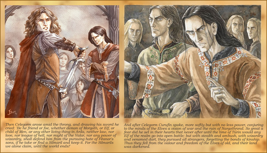 ![]() ![]() ![]() This was a collaboration with German Tolkien artist Anke Katrin Eißmann that was a lot of fun to do. We decided we'd illustrate a scene of Celegrom and Curufin in Nargothrond - hers is the one on the right, mine the one on the left. June 2005 Watercolour (Anke), Watercolour and Photoshop (me) ![]() ![]()